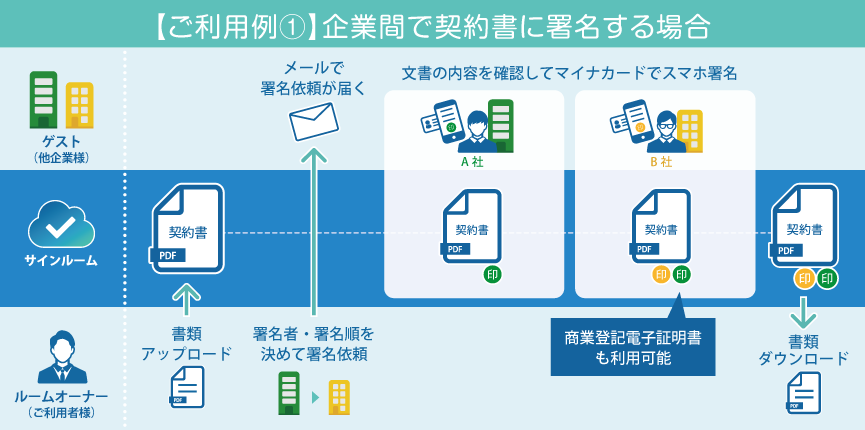 「サインルーム」は、ゲストを招待して本人確認や電子署名をスマホで簡単に行っていただけるサイバー空間の応接室です。