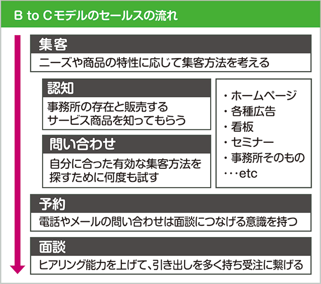 以上のように「B to C」モデルの新規セールスには、集客・認知・問い合わせ・予約・面談という5つのプロセスが存在し、各プロセスが適正に実行されなければ効果をあげることができません。難しくはありますが、様々な改善を行うことで課題を抱えているお客さまとお会いして解決のお手伝いをすることができるわけですから、それ自体面白いお仕事とも言えます。ぜひトライしてみてください。
